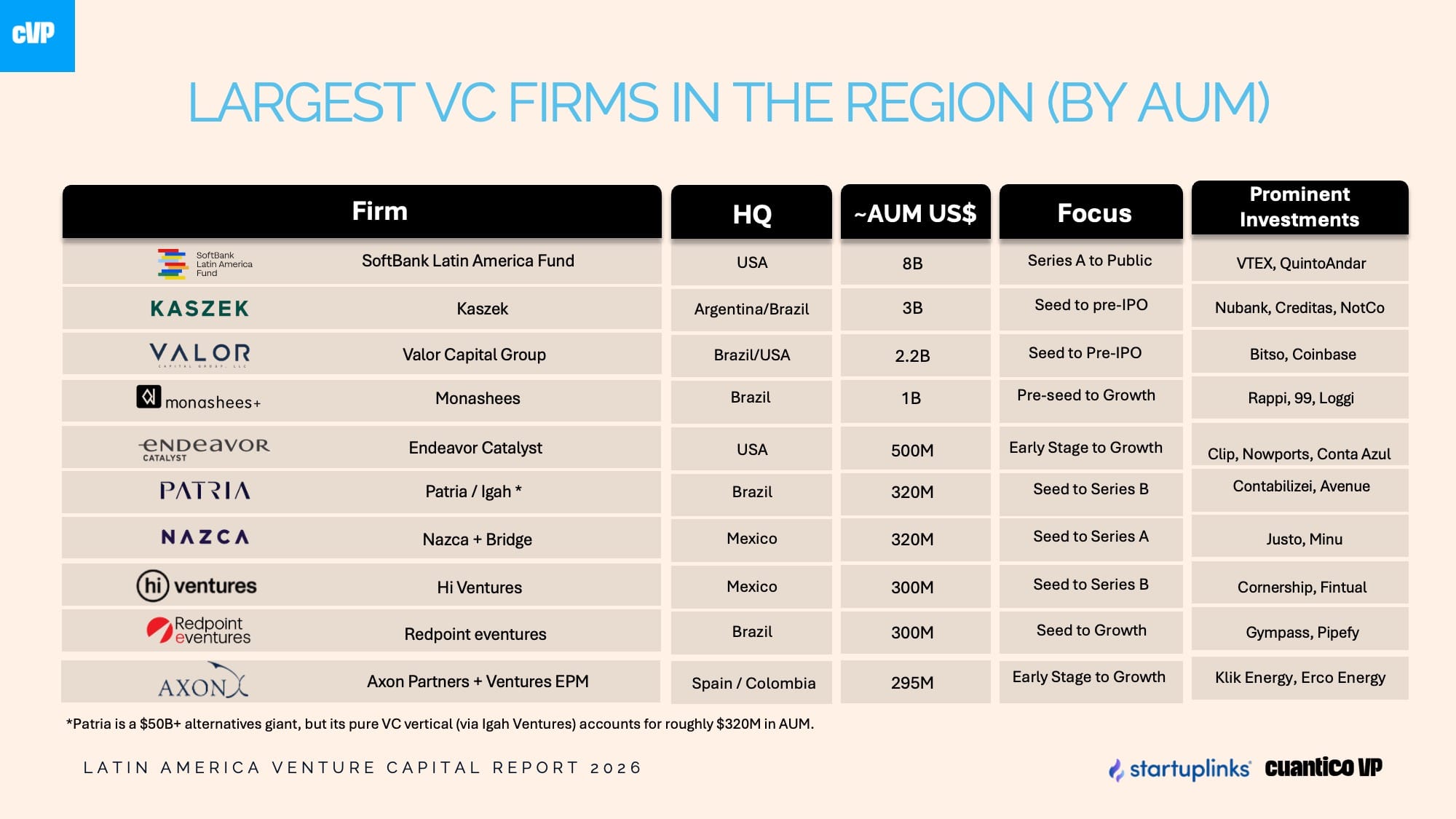 Patria Investments, with over US$50 billion in assets under management, entered the venture capital space through its acquisition of Igah Ventures in 2022, bringing its VC allocation to approximately US$320 million.